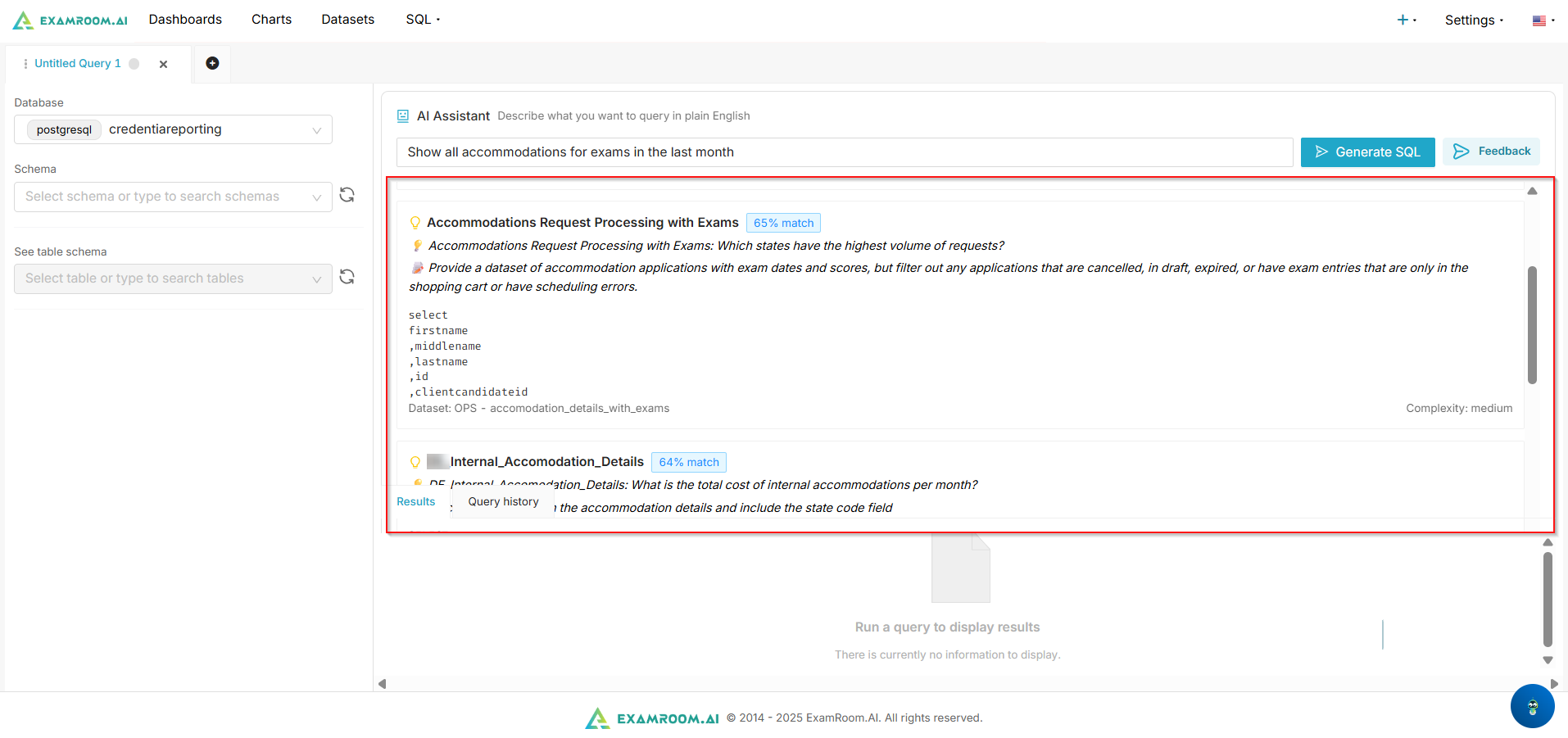 - Be specific for better accuracy: Include details like dates, filters (e.g., "exams scheduled today"), aggregations (e.g., "count by date"), or joins (e.g., "include candidate names").