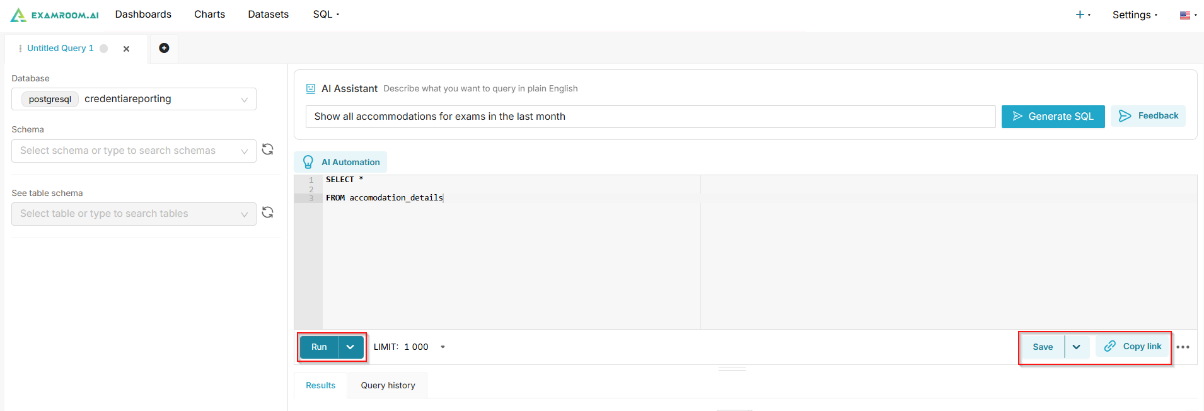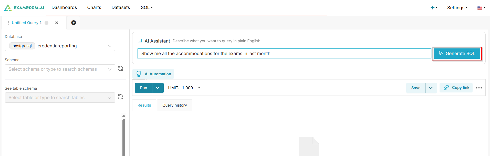 - The AI will automatically populate the SQL query editor below with the generated code. Review it for accuracy: