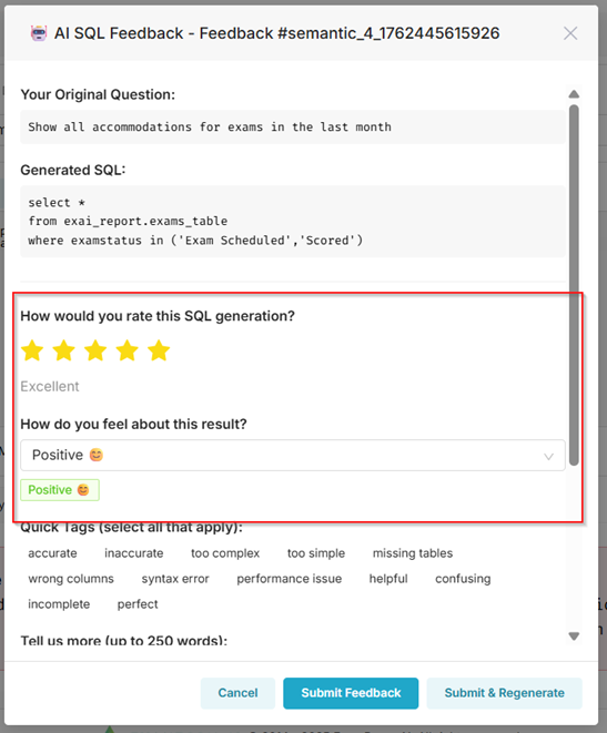 - Your original question and the generated SQL will be displayed in the top section of the feedback pop-up box.