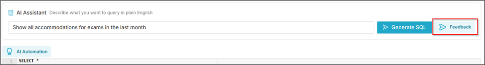 - You can give feedback on the results you received from generating SQL queries with the AI assistant. See AI Assistant SQL Feedback to learn more about submitting the feedback.