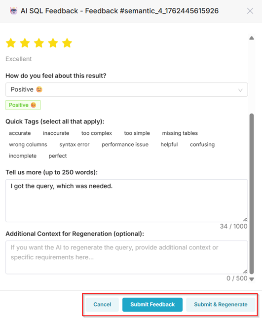 - Click Submit & Regenerate to submit the feedback and generate the SQL query again.