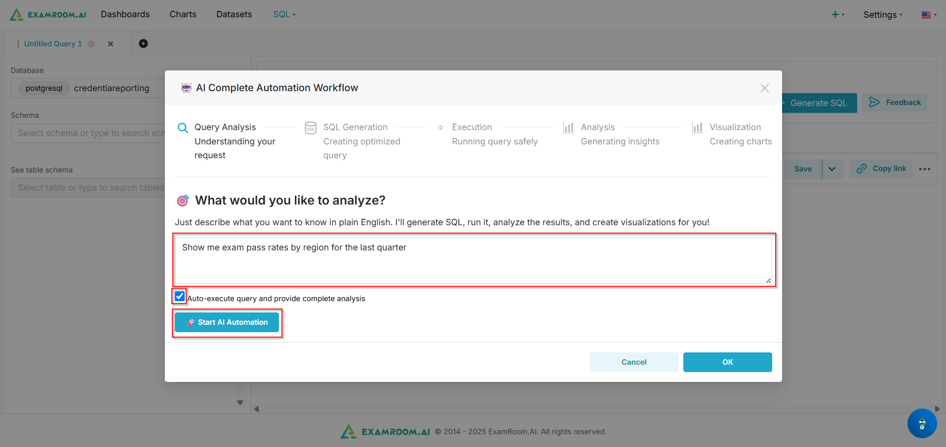 - Check the box for Auto-execute query and provide complete analysis if you want the full automated run. This enables end-to-end processing without pausing at each step.