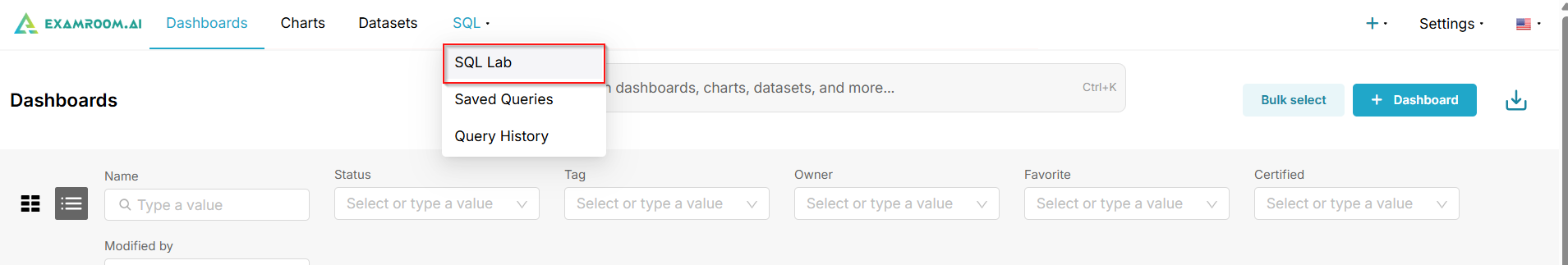 - Click SQL from the top navigation bar and select SQL Lab from the dropdown menu.