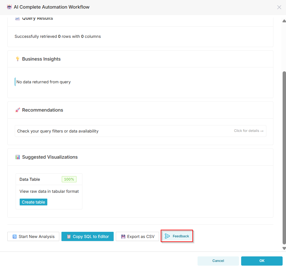 - Once the AI Automation workflow is finished, you can find the Feedback button at the bottom to submit your feedback. Click the Feedback button.